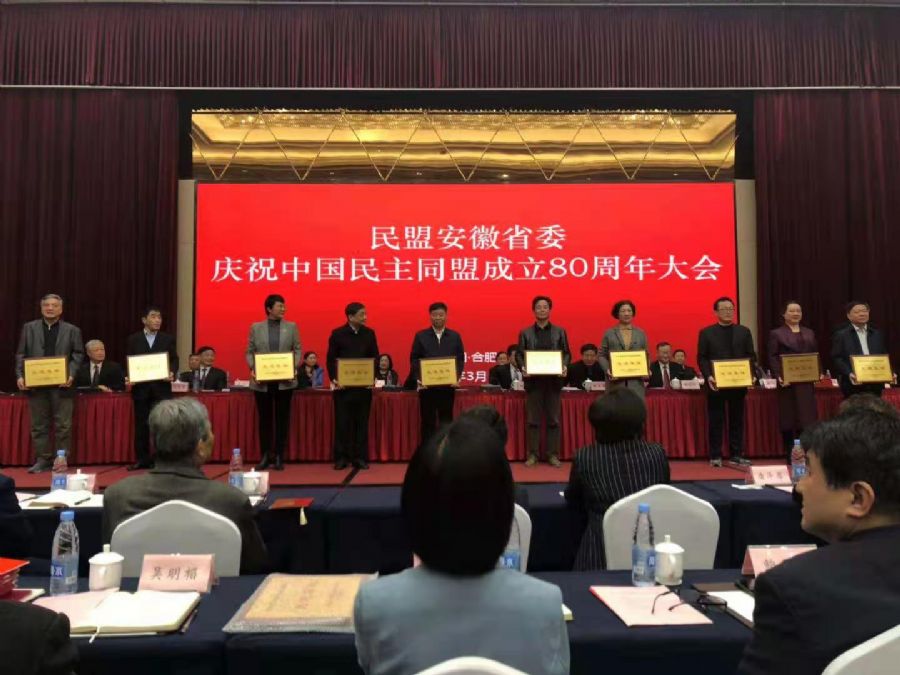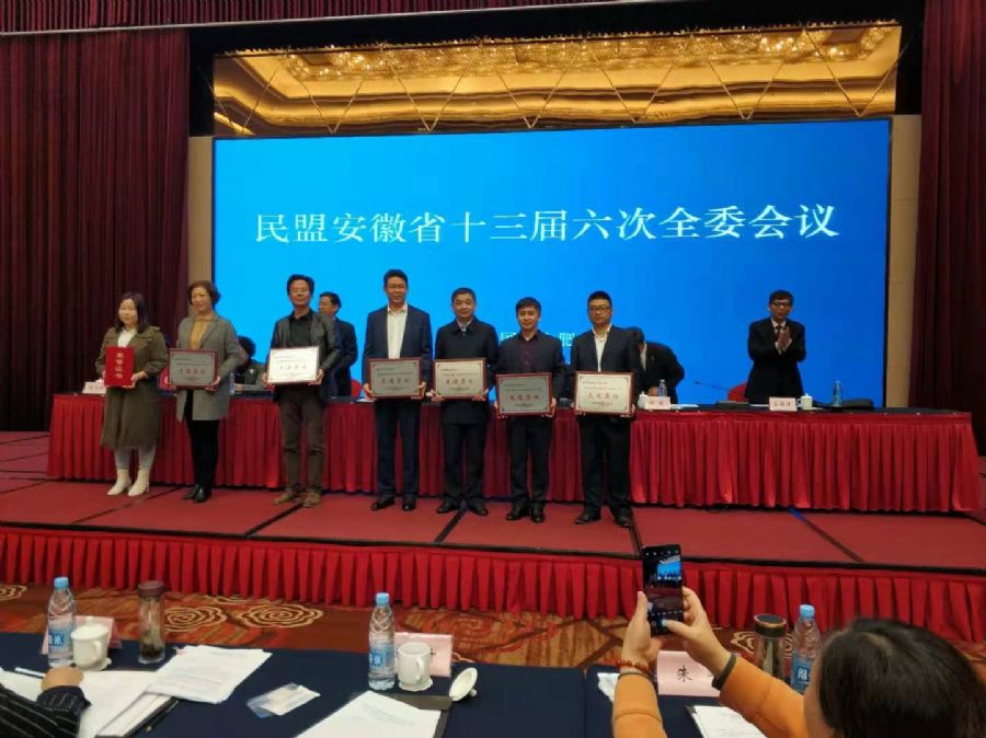 安庆市政府副市长、民盟安庆市委主委杨林,民盟省委委员、民盟安庆市委会副主委项学军,民盟安庆市委会专职副主委施取金代表盟市委分别上台领奖。